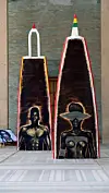 After the looping video fades to black, observers begin to take note of the other elements of the installation, each one playing an emblematic or metaphorical function. Another canoe, created by a Lebo boat artisan in Son Beijoon, near Dakar’s fish market, is cut in half with each part vertically erected to simultaneously resemble both a tomb and a shrine. On the front of it are some of Peskine’s acupaintings—images he creates with nails that sit at different heights on wooden surfaces, providing yet another three dimensional aspect to his work. On each part of the canoe, we see the upper body of a figure standing upright in god-like majesty, their postures reminiscent of warriors prepared to enter a battlefield.