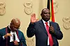 Cyril Ramaphosa (R) holds up his right hand as he is sworn into office by South Africa's Chief Justice Mogoeng Mogoeng (L) in Cape Town, on February 15, 2018.Photo: RODGER BOSCH/AFP via Getty Images